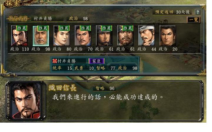 信长+兰丸+信忠三个人一起建3个町(1个商人町,1个农村,1个武家町),剩下的4个人建3个田和一个市。信长,兰丸,信忠3人回来后建几个市,前提是能保证在换季前完成。然后他3个人再去建2个职人町和1个武家町。接下来政治上40的人开足马力建铁炮学舍,其他人建市和田。市和田的建设一定要在换季前完工。垃圾们在换季前回到城里,马上流放之,就这么录用一批,每人建设一个市或田,然后又流放,免费劳动力,呵呵。