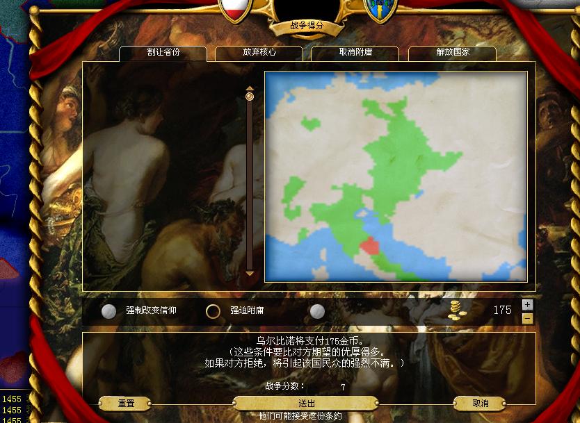 这段时间什么都不干,就是过时间-BB,顺便执行皇帝的使命,还是那句话:我们不要地,只要钱!神罗小国都很有钱。由于战斗过于简单,我就不截图了。期间打了N个神罗小国,都要了钱了。一般都是1000块左右