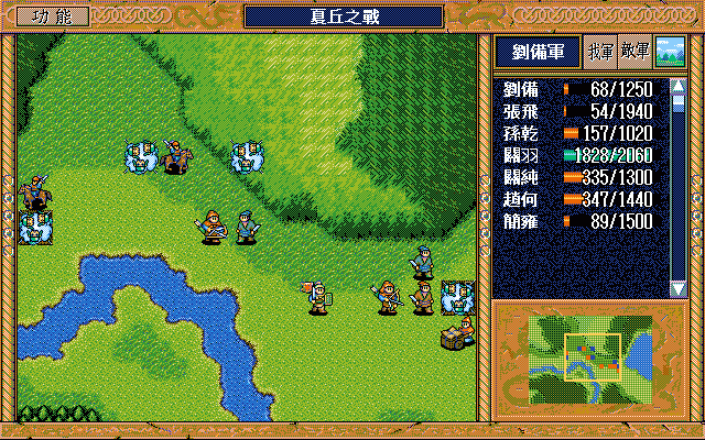 我 赵云右下牵制骑兵2(成功),藩宫右方火龙(成功) 张飞下攻灭郭嘉,简雍右方假情报(成功) 关羽右下牵制步兵3(成功),刘备左上假情报(失败) 关纯左方两格射灭弓兵2;
