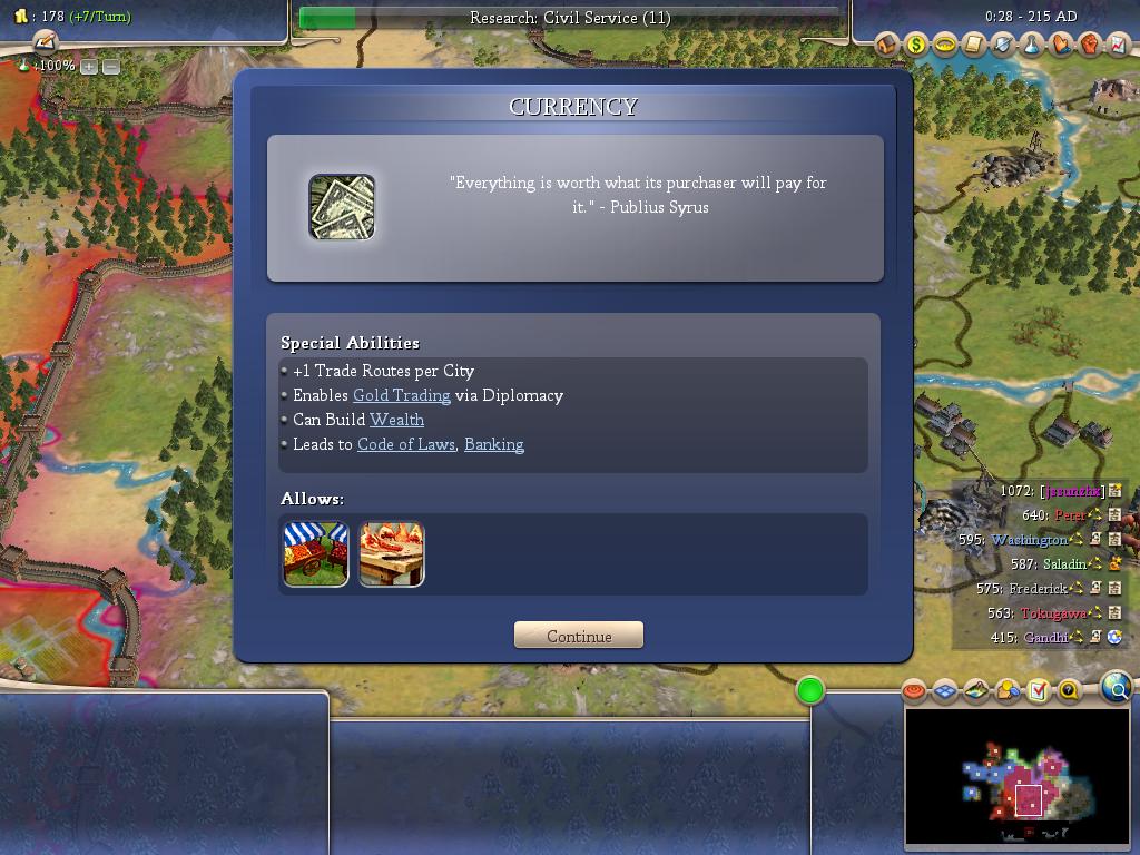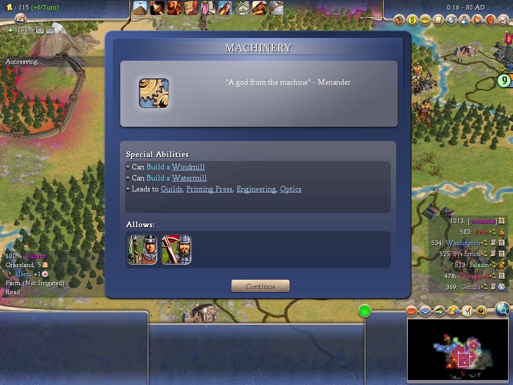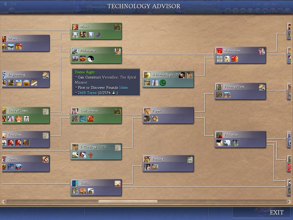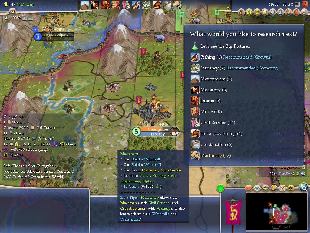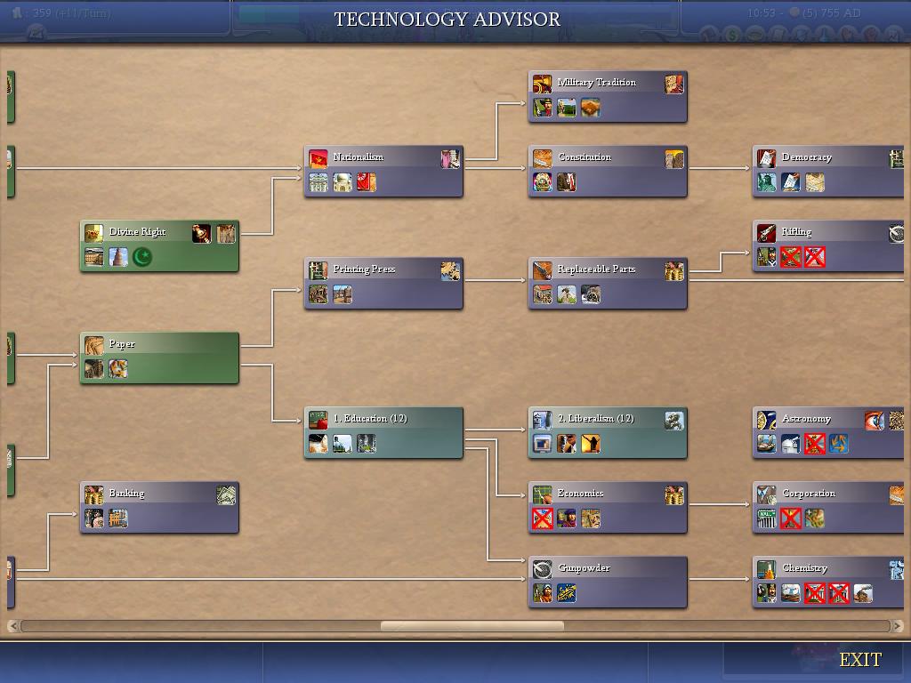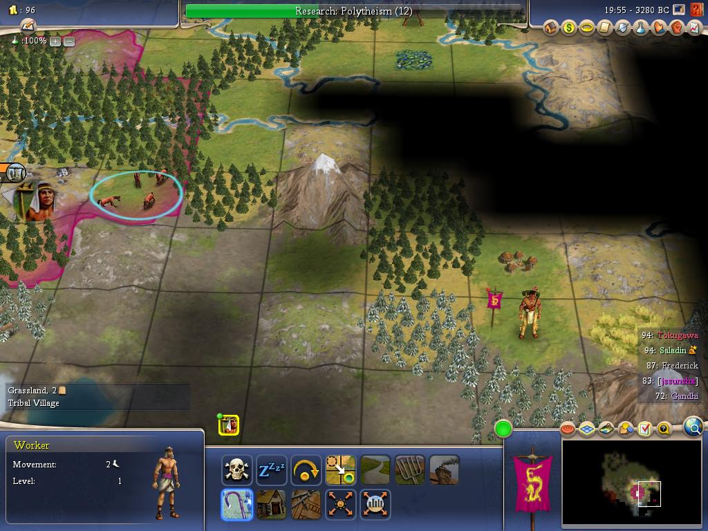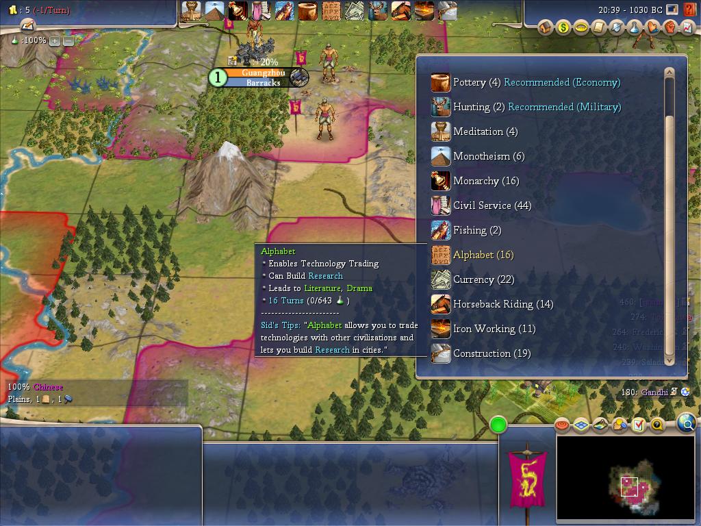 科技方面,按惯例是青铜优先的,不过看看这副图,食物实在是短缺,自然成长的话恐怕得NN年后才能利用上大理石,权衡再三,还是首发动物驯养了: