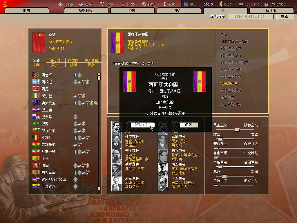 这时,外交战线上传来喜讯,一向支持工农运动的西班牙左翼政府表示愿与苏联结成反对轴心国的同盟。