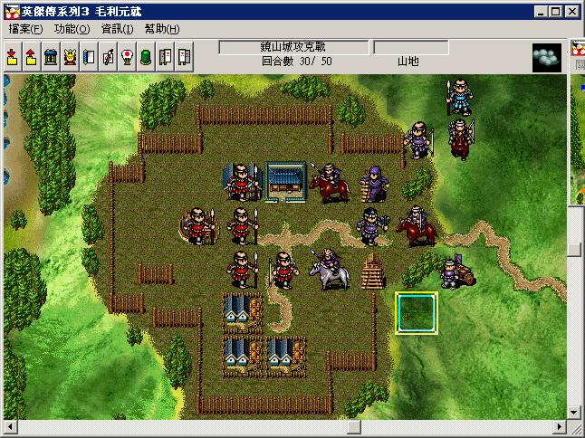 2:开局其他人向下,6回合的时候到达山口.第7回合,第8回合,继续向下,其中世鬼要连用两次快步,堵住敌军向城内进军的路线.到16回合左右第一批敌军全部消灭,并引出左上的敌援军.然后福原独自向左上行走对付敌援军(重要,如福原把他们引下来,暂时经验会多些,但是运输道具的路线会被堵塞,恢复酒会不够,也不能保证福原能攻击到最后一回合),其他人进军中间的小岛,岛上上方鹿砦的弓兵留着,让口羽反击到结束.剩余的人直奔敌主营.