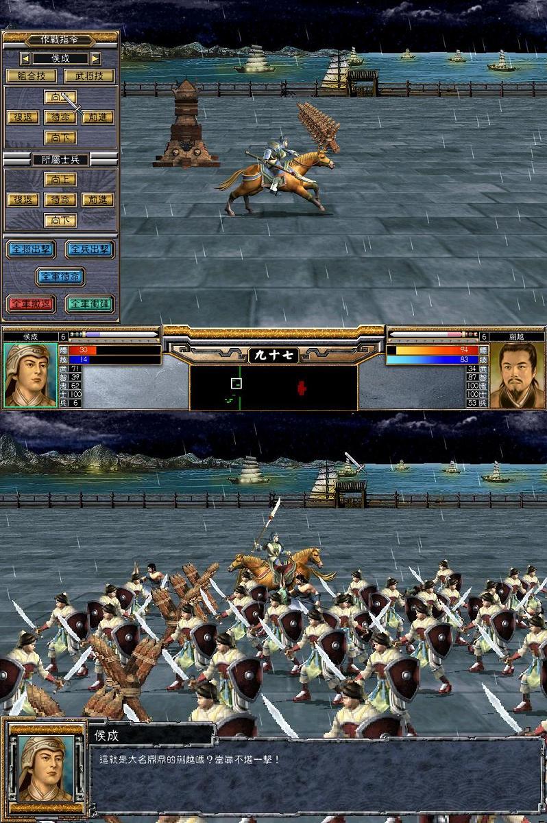 偶:你不用怕,我已经调查清楚了,敌军的将领跟你是半斤八两,没事,你用弓不错了,不用和他们近战阿!瞄准了狠狠地射!你还有弓自带的武将计阿落月弓呢!没事,注意躲开敌人的小兵阿!最好搞俩个步兵自己防防身!