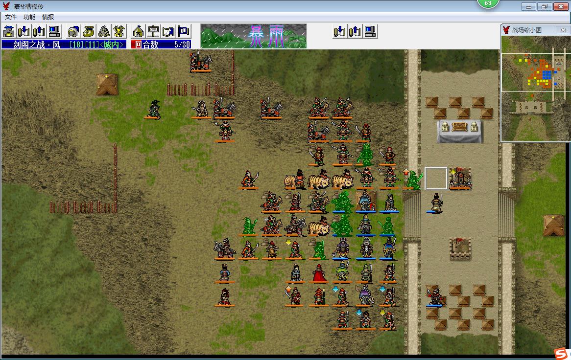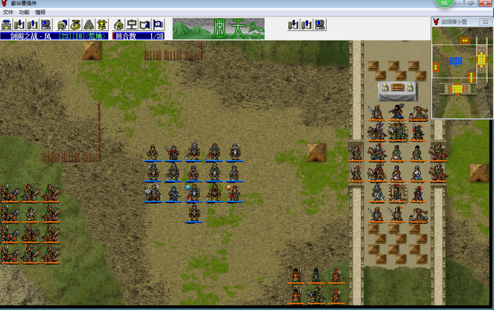 剑阁的敌军算是动用了吴蜀两国剩余的全战力,总人数是80人,其中名将34人,数量占据将近一半,非常可怕。因此,优先击杀敌军的名将,尤其是杀伤力巨大的武将和会补给的文官非常重要,如果开局了杀了过多的小兵,由于我军不断有人员撤退,很容易造成后面我军和敌军的实力对比严重失衡。所以,开局对敌军关外步兵攻击范围的小兵最好不要先杀,远程能忍则先忍,集中力量剿灭敌军名将,前面六七回合杀敌军名将的占杀敌总人数的比例最好能达到七成以上,后面打起来就会相对轻松很多。