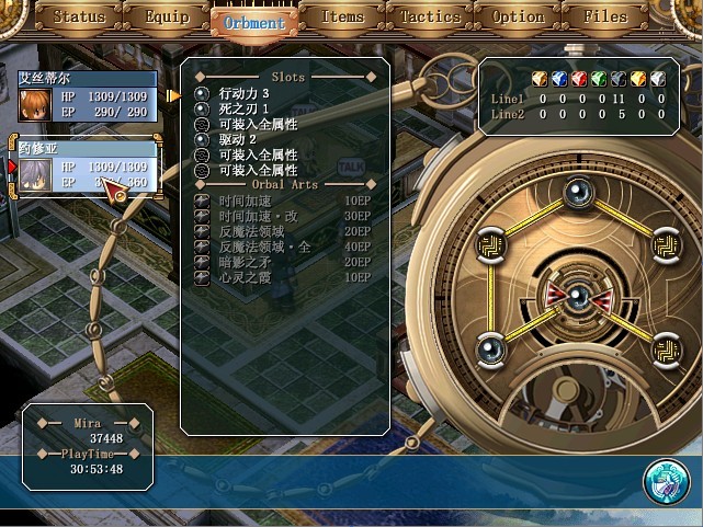评价:主角,导力器没有任何属性限制,而且结晶链也只有2条,4孔也不算短,可以配备出许多终极魔法,本来是想配出火系的终极魔法的,但是发现2个结晶回路的属性对魔法没有帮助,于是想转地系或者水系,观望中.......