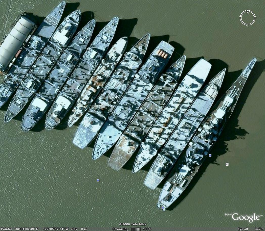 另外美帝的衣阿华号虽然已经退役,但没有被拆毁或改装,而是封存在旧金山附近的湖里,发生战争的话还是可以拿出来用的,以下是google地图上找到的,最右边那条就是衣阿华