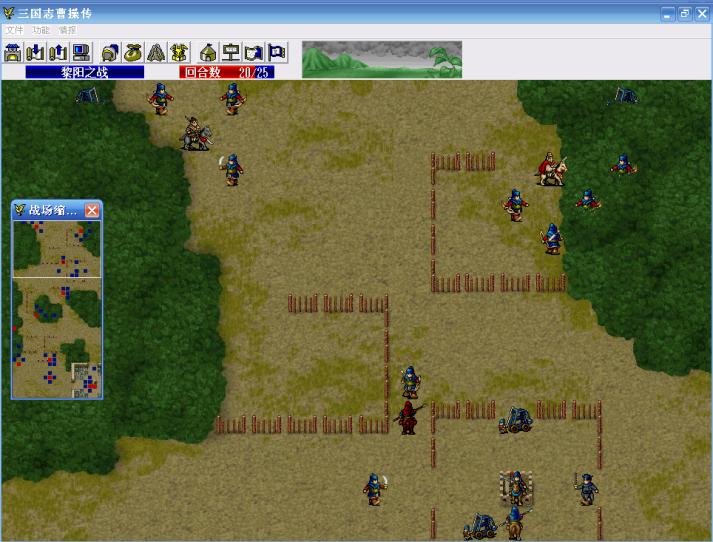 第一回合,典韦凭借爪黄之力,进入区域(0,0)-(19,28),也就是越过第一道栅栏,引发栅栏里的7名敌人主动出击,曹操引一个弓兵,不要让他挡典韦北上的路,张辽引那个步兵,曹仁往上走准备过栅栏,其他人往袁谭所在的城里走。