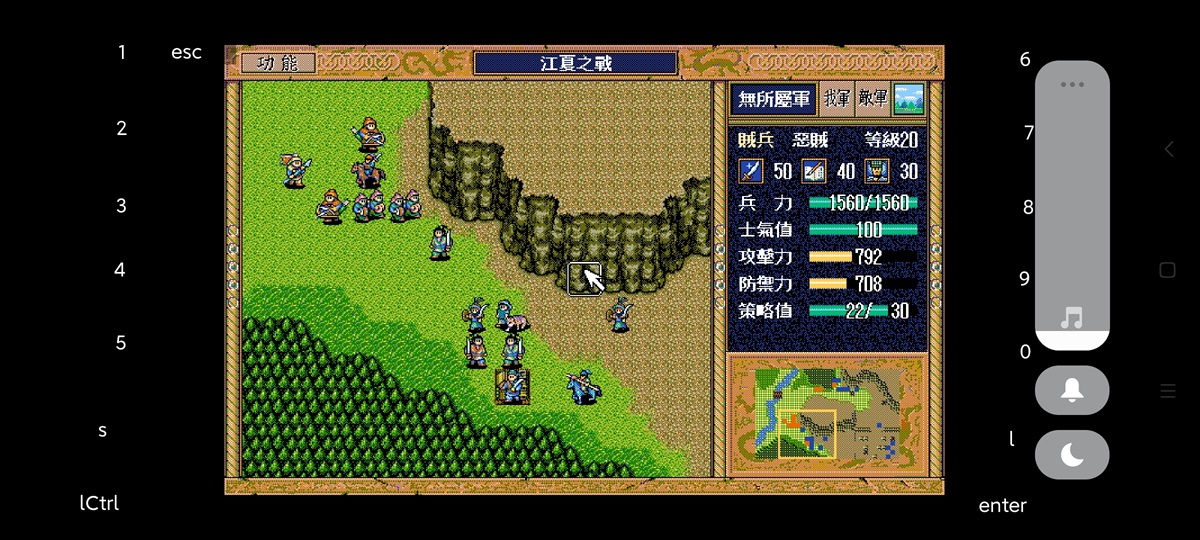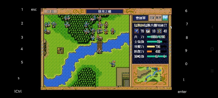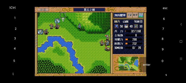 第18回合初右图,关羽上来引敌,由于关羽在敌军乐攻击范围内,敌军乐会进树林鼓舞夏侯兰,把夏侯兰士气激励满的同时也相对前进了1步。夏侯兰补满状态在山上周仓1次只反100多,可以反10多次。