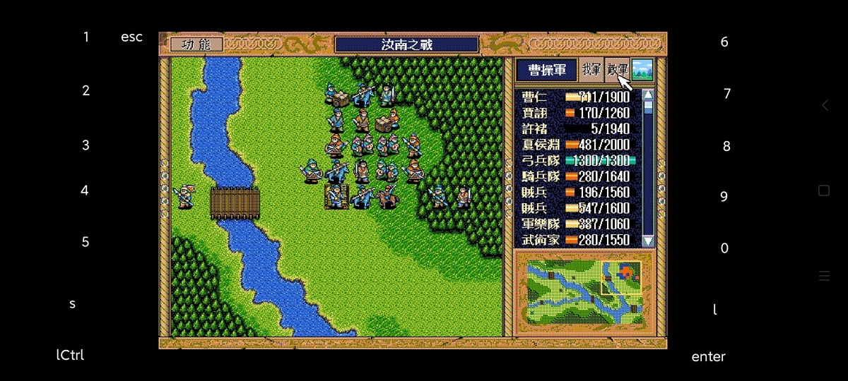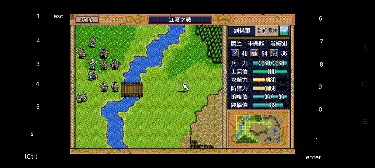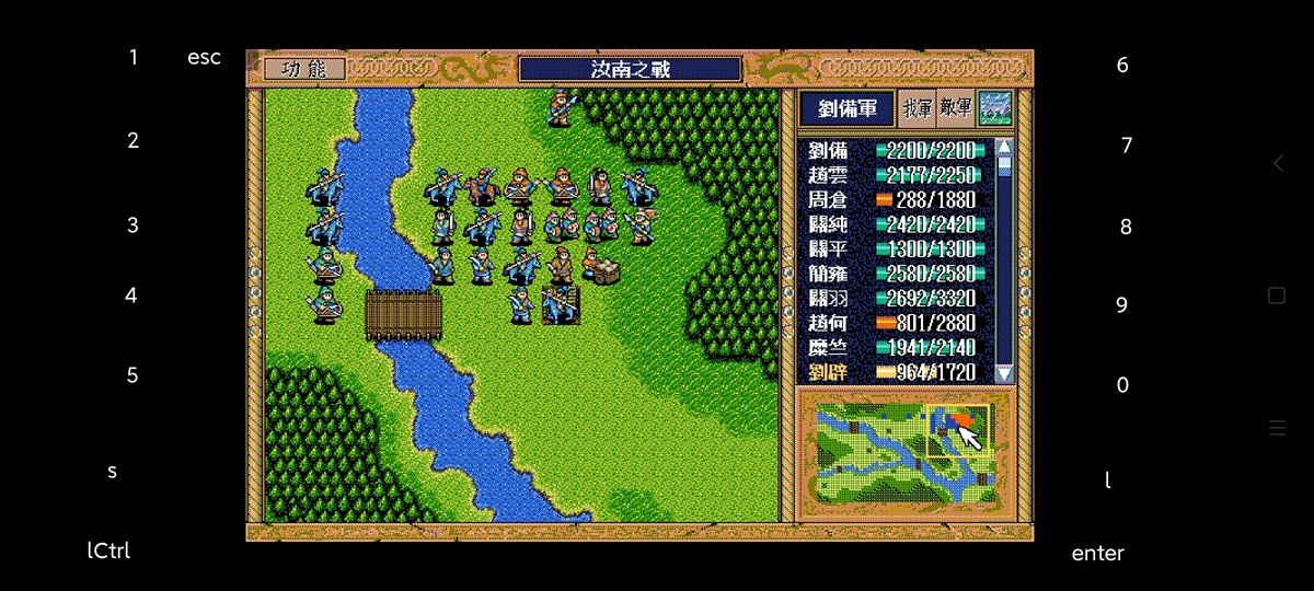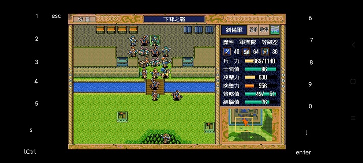 第36回合初图,关羽和简雍一起引来了最后一批敌人于禁和2弓兵。夏侯兰被反击到没血了,要引上去给刘封吃。