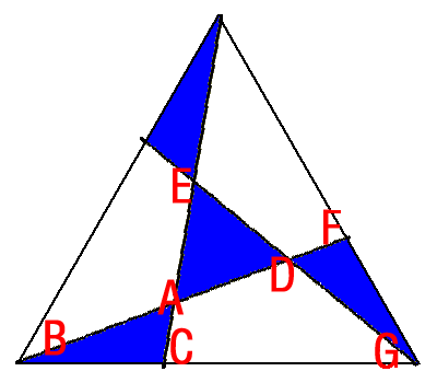 设大三角形面积为S。当C点的位置从B移动到BG中点过程中,中间的小三角形ADE面积从S到0,而三角形ABC的面积从0到S/6,其中肯定存在一个位置让ADE和ABC的面积相等。我们就假设下图中即为这种情况,且ADE的面积=ABC的面积=1。