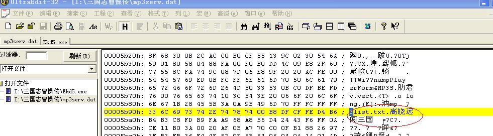 在打开文件 你的三国目录里有个叫mp3serv.bat 的文件 按ctrl+g 输入0x5b90 回车 看到: