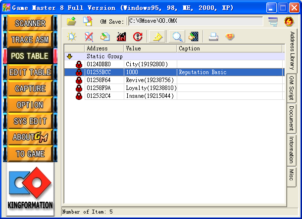 开启Game Master 8后 选择游戏进程 载入这个修改存档 具体细节可以点选GM Script修改函数代码 这里只介绍一下修改了那些项目