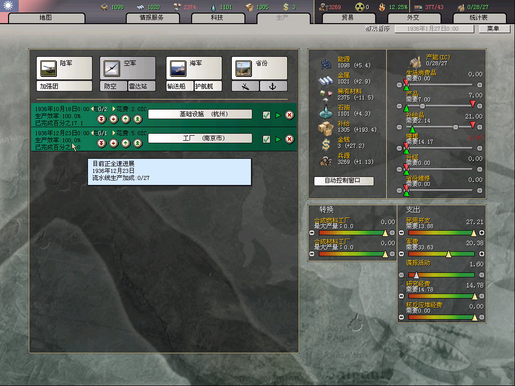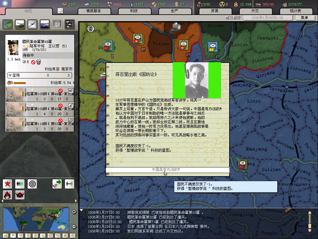 然后顺便说说这局的基本科研思路,只研究陆军、陆军战术、工业3个体系。开战前尽量快出36步兵,然后开战后尽可能研究陆军战术,工业研究为前两者服务