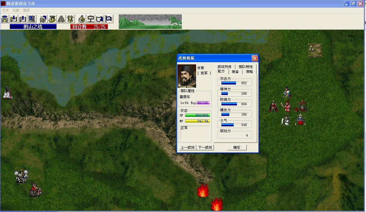 开了特技,可以出场了,因为他只有4级,MP不够触发特技,所以要给他穿上紫绶仙衣,这样一出场就自动触发特技了。注意本关开始出场的只有4个人,但是就算吉青没有出现,特技也会被触发的,为了避免浪费回合,选择武将时一定保证他跟着岳飞一起出场。