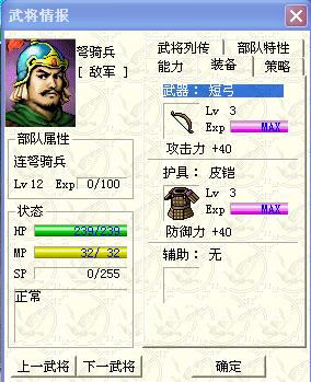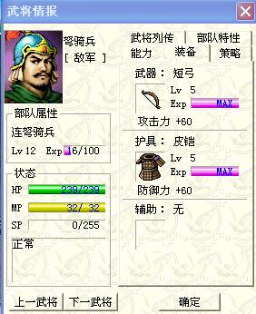 bug*2:1、虽然装备限制写着君主等兵种可以装备,但“衣服”类的防具曹操等都不能装备;2、汜水关必须要我军动一个人才能出伏兵、开战!