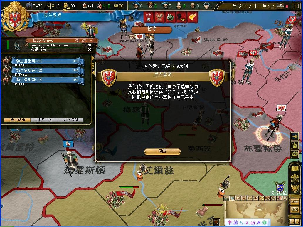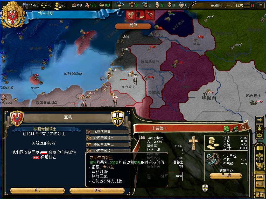 现在只有12的bb,公国还是有余力继续作战的.......接下来的目标是....条顿.作为将来普鲁士帝国的重要组成部分,一定要拿下条顿骑士团的大部分领土........正好也有合适的宣战条件....那还说啥,宣战咯....波兰居然还是他的同盟?不怕死就继续来吧....