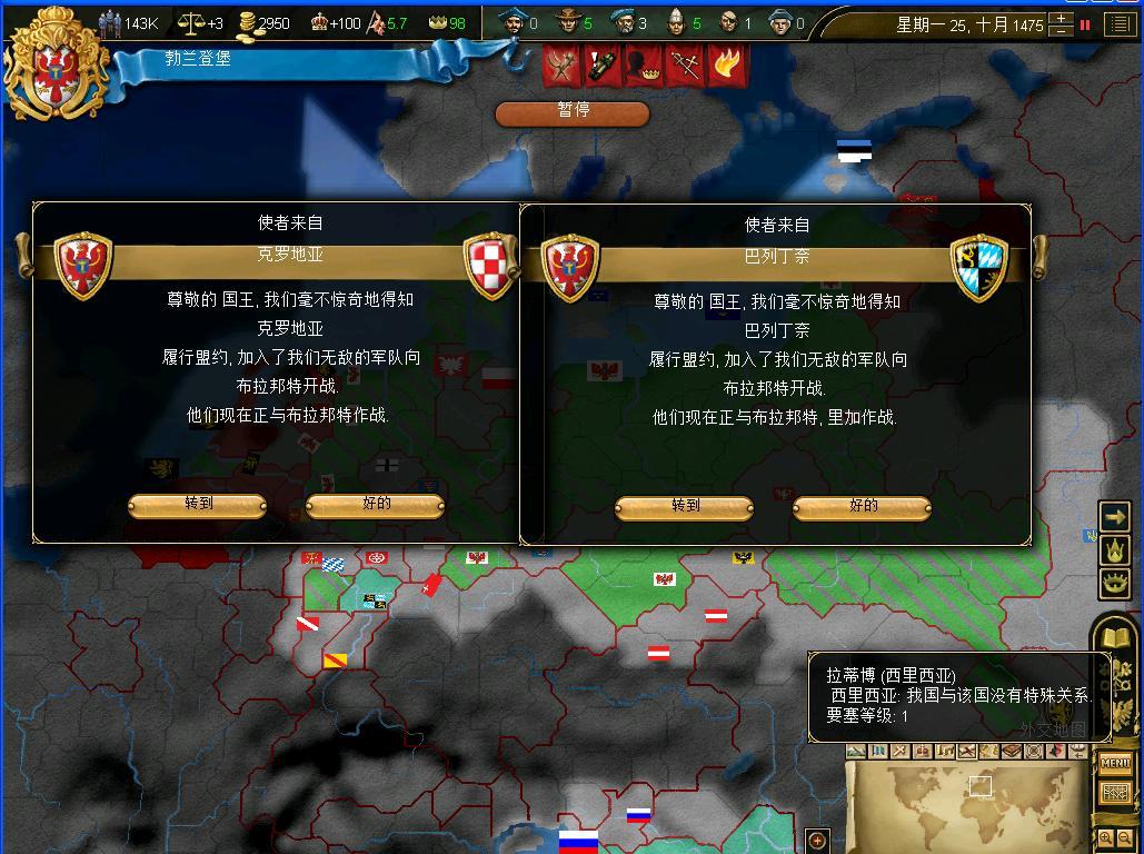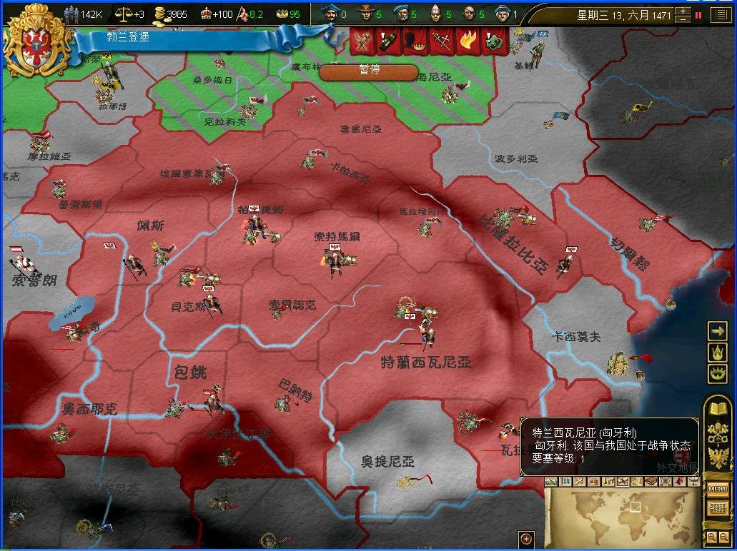 得........属国继续被攻击了,作为皇帝国,不能丢这个份啊.........没办法,出战啊........对手是...巴伐利亚,匈牙利等国.........哎,优势整个欧洲大战了