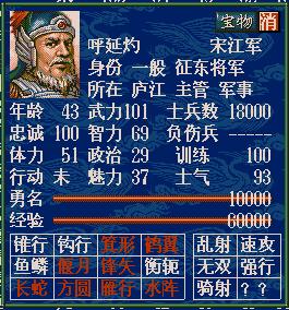 3.双鞭呼延灼。呼延灼是五虎将中另一位忠臣良将之后,其祖上是大宋朝开国功臣河东名将呼延赞。呼延灼“双鞭”的绰号得来于所使的两条水磨八棱熟铜鞭,左手的重十二斤,右手重十三斤。说到这儿插一句,小时候最早读水浒时,总以为呼延灼使的是两条软鞭,就像现在武术表演中看到的那种。以后慢慢理解了,才知道是两根有竹节状棱角、像短棍一样的兵器。真不知道作者为什么说是两条而不是两根或两杆,施耐庵自己的量词使用没学好也就罢了,可他这么说害的俺好几年都是拿两条唱戏的马鞭扮呼延灼的,这真是误人不浅啊!除了使双鞭外,呼延灼出阵时的标牌式打扮是一身黑色披挂。穿皂罗袍,披乌油甲,骑着那匹浑身墨锭似黑、上下没有一根杂毛、四蹄雪练价白的御赐踢雪乌骓马。书中有一处专赞呼延灼的诗: “堂堂卷地乌云起,铁骑强弓势莫比。皂罗袍穿龙虎躯,乌油甲挂豺狼体。鞭似乌龙X两条,马如泼墨行千里。” 一句话,呼延灼扮相威猛无比!这还只是呼延灼自己的打扮,更糁人的是呼延将军手下兵卒也是黑色引军旗下人人黑盔黑甲黑衣黑马。这支黑色马军如乌云般卷来,似鬼魅像阎罗,应是极具震撼力的,绝对能起到让敌人未战先怯的效果。呼延灼武艺高强,虽曾有与几位一流武将几十合内打的难解难分的记录,但也是除关胜和林冲之外的另一位单挑中从未尝过败绩的水浒五虎将。除了万夫莫当的武力,呼延灼给人印象深刻的应是其率兵用兵能力。呼延灼大摆连环马的故事千百年来家喻户晓,脍炙人口。呼延灼的帅才可能与其沉稳的性格和极佳的心里素质有很大关系。