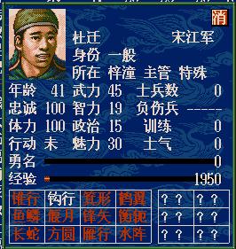 1.大刀关胜。关胜显然是武圣关老爷的克隆,只不过是从三国演义中搬到了水浒,从汉末三分天下来到了北宋末年。要说这老关家的基因可实在是好,传了近一千年都不走样。到关胜这儿,还有与其祖爷爷关云长一样的“规模”:大高个,八尺五六身躯(比关羽的九尺略低一点,但有可能是古时粗糙度量衡系统所致的误差),红脸膛(面如重枣),凤眼朝天,两眉入鬓,细细三柳髭须(胡子短了点,关老爷的胡子让给了朱仝)。既然已有了关氏标签中无法仿冒的相貌部分,剩下的就只是早已标准化了的关公道具、行头了,戏班子里就能找得到。关胜出场时当然一定是要穿绿色战袍的,并身披黄金甲,胯下赤兔马(不知是否也是关爷爷赤兔龙驹之玄孙啊?哪位懂马的兄弟能否解答一下?呵呵),掌中一把青龙偃月刀(书中没说重量,但肯定没有八十三斤,也不会比智深大和尚六十二斤的禅杖重,估计有四五十斤的样子)。关胜丝毫不敢辱没祖先名声,不但把青龙刀使的精熟,赢得个大刀关胜名头,而且还幼读兵书,深通其它诸般武艺,具有万夫不当之勇。套句三国中的说法,关胜万马军中取上将首级也应该是犹如探囊取物一样。全本书中,除用青龙刀隔开张清飞石无心恋战而回阵的小小尴尬外,关胜在所经历的百十场厮杀中并无任何失手之处。作为作者施老先生从三国演义中搬来的镇书人物,关胜的武力在水浒中即使不算数一数二,也毫无疑问是数三数四的。这关胜也颇具先人遗风,常常帐中秉灯夜读。更为可贵的是,小关读的是兵书战策,不是关爷爷有点装样子的春秋,其勤奋务实形象犹胜其祖。可能是饱读兵书和勤于实践的缘故,大刀关胜还是一百单八将中难得的帅才。在俺看来,与其祖爷爷关君侯相比,关胜去守荆州可能更令人放心,当然前提是东吴不派呼延灼去诈降。