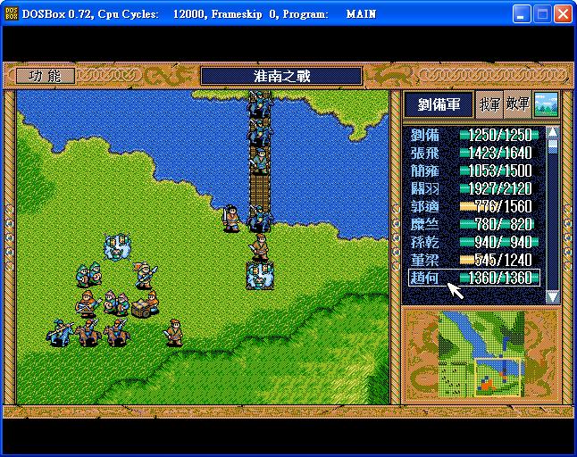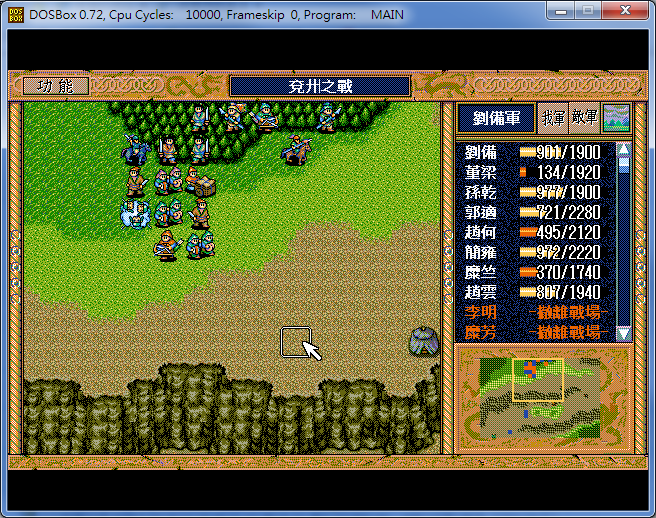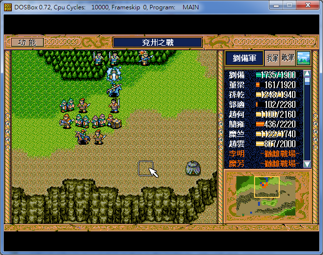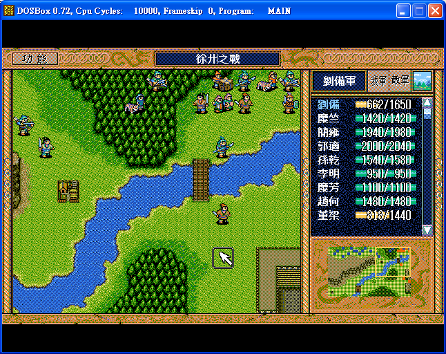 開始道具︰以賣矛所得金如下配置 - 劉備5豆1酒1刀,關羽8焦熱,張飛7焦熱1豆,餘1010金