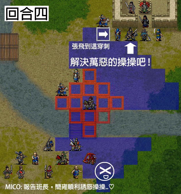 → 下回合 , 敵方弓兵會主動出擊 , 這時切記別靠近城門 , 等弓兵都清完佔了城門再觸發敵伏 (MICO觸發伏兵後5回合右方友軍才過來增援 =.=)。
