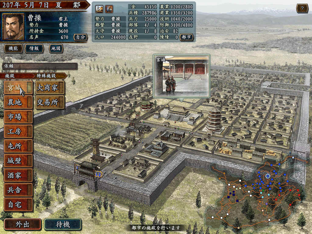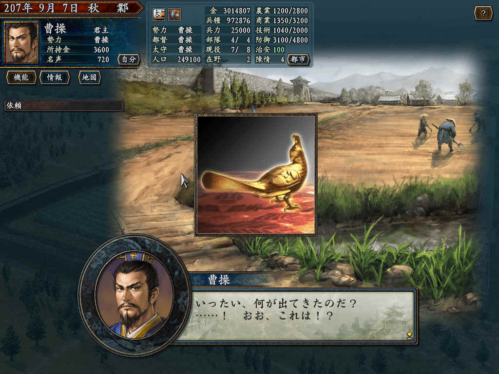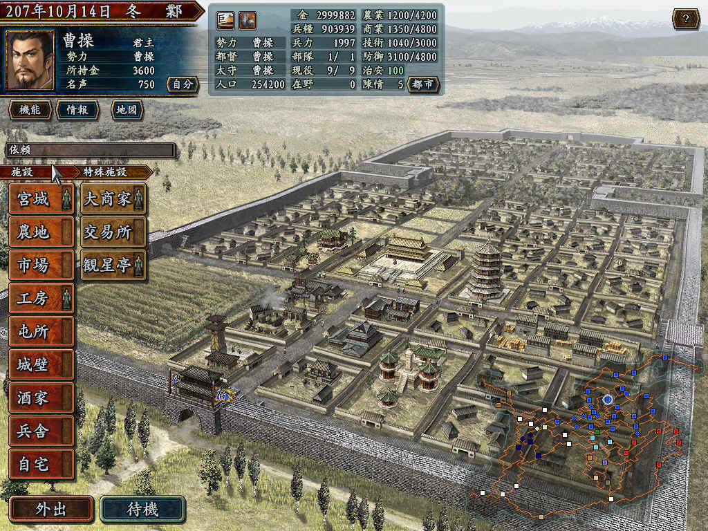用207年剧本;发生袁尚被灭;程显计策使得老曹绑架徐庶老母;河北统一;获得官爵公!曹操必须首都在邺;城市规模为大;治安100;走进农地发生!