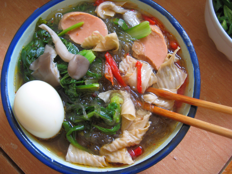 步骤5 最后把粉条,烫好的菜 豆腐皮 蘑菇 鸡蛋 高汤 依次放入碗内 搅拌