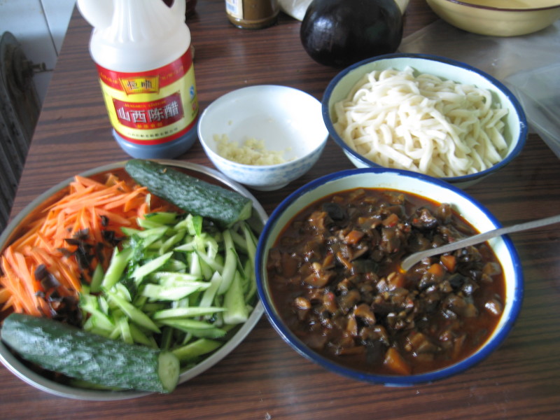 第4步 煮好的面条过冷水 放入碗中 先放上香菇茄子酱 再依次码入红萝卜条 黄瓜条 木耳条 蒜粒 放点山西老陈醋 开吃吧!