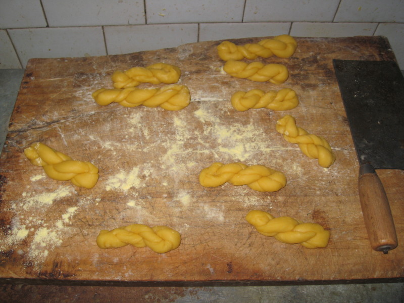 5,将小面团搓成长条,对着搓成麻花状(要搓紧一点)然后再对折将一头塞入另一头里。。