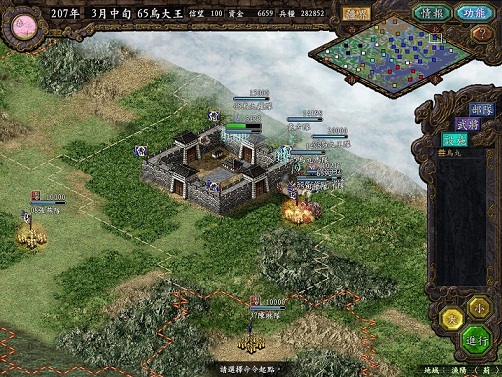 正忙碌着,4月开春了,曹丞相的大军又来了,张辽于禁也就罢了,司马懿也来了,咦,这家伙这么快已经出场了吗,再看看,郝昭都出兵了,天啊,他不是20年后跟诸葛亮对峙的人吗,怎么现在也已经是大将了,我晕。赶快赶快,再从襄平回救乌丸。虽然乌丸城有连弩兵法,但也禁不住司马懿他们的混乱攻势。一会儿“你们的粮仓已经没米了”,一会儿“投靠我军,分田分地”。乌丸城内诸将有心无力,又被曹操华丽的推倒了。。。