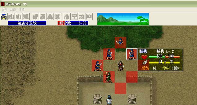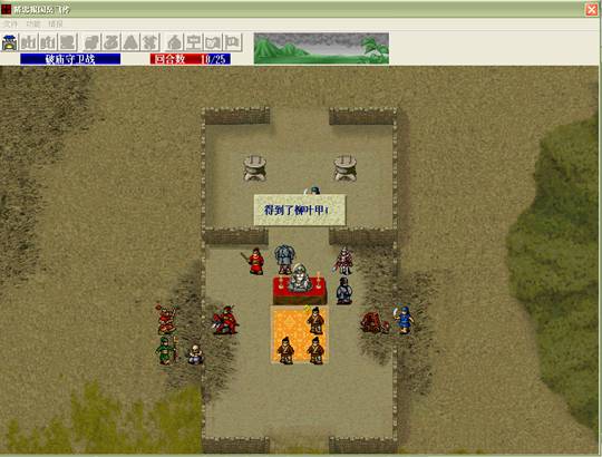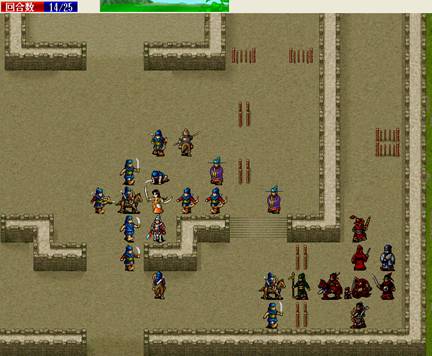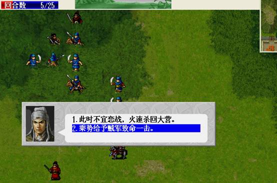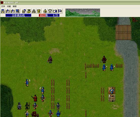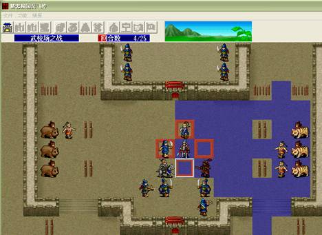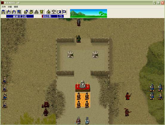 很多人都说第三回合才把伏兵引来,可是我不同意,因为这样 = -1回合所以第二回合马上引出他们,吉青组由岳王挡住,其它人马上过桥(图1)