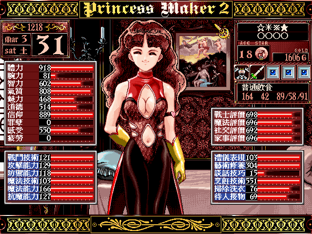 十四五岁以后一切都太轻松了,去教堂打工降罪孽加道德,降好了就做老师加道德加母性,由于做老师很累,教书两次后又可以去东部加烹饪技术,魅力降得多就去跳跳舞(反正体力和艺术表现这么高,魅力再怎么差也有200以上,那个死敌想赢饿?做梦),到后期又出现了失误,多做了两个月无谓的事(过分关注智力),魅力未上500,比较遗憾,不过不影响优秀女王的结果。