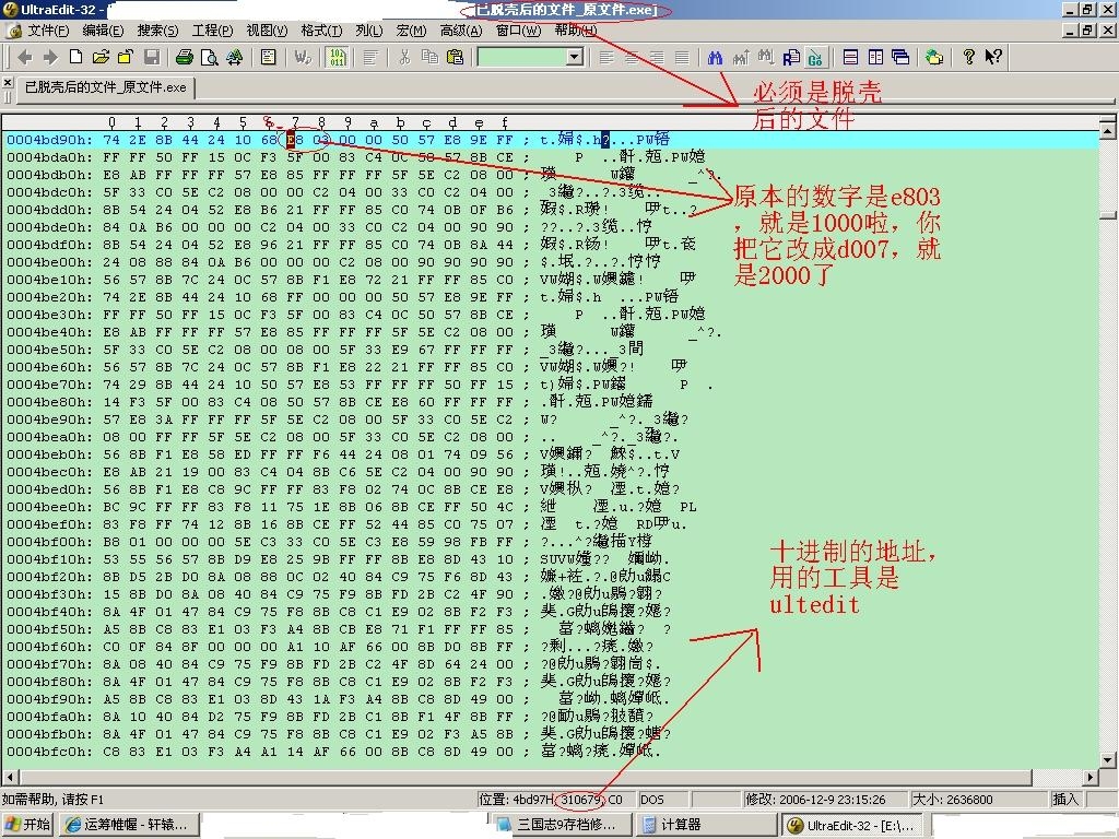可以修改为d007,即2000。你会对我说:什么叫10进制吗?用什么工具修改吗?那么我把修改的方法用色彩和图形的方式发出来,细看上面的3个红色椭圆圈和说明,相信没有人不会弄啦