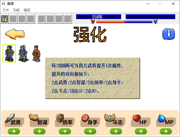 玩家可以在战前直接花费金钱提升武将能力,再也不用在战斗中消耗行动数来不停地吃果了!