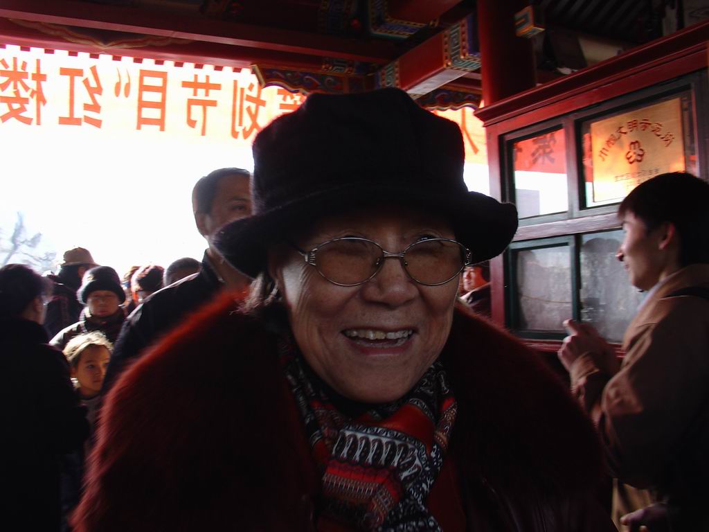 我挽着扭了脚的女生一路小跑的到了“省亲别墅”,因为她咬着牙说今天要疯狂到底,就算明天住进医院也再所不惜,这样近距离的集中的接触自己喜欢的演员的机会太少了,简直千载难逢。后来我问开洁她第二天果然去了医院,不过所幸没有伤筋动骨,肿几天就好了。在“省亲别墅”大殿的台阶上,电视剧《红楼梦》的剧组人员集合在一起给大家拍照。因为去晚了会儿所以他们正面的最佳位置被那些扛摄影机的记者占据了,我于是溜到了最右面,“妙玉”紧挨着“薛蟠”就站在我的面前。“妙玉”穿一件蓝色外套,依然亭亭玉立,身材似乎比20年前更清瘦,大大的眼睛深深的凹在眼眶里脉脉含情,活脱脱一个“可怜金玉质”的冷美人。在那边我有几个绝好的机会本可以拍到她还有薛蟠这位薛家唯一的代表的单人特写,然而就在那时我的相机开始不争气的一个劲卡壳。我激动的叫一声“妙玉姐姐”然后她扭头微笑的看我然后我按下快门然后很遗憾的发现没有过卷,于是我只好把相机塞进我那其实透光的黑色挎包然后把手深进去打开后盖然后摸索着把卷卷过去并在胶片上留几个手印然后做出若无其事表情其实心急如焚的扣回后盖掏出相机然后对着他们再喊一声并解释说我的相机刚刚没过卷。我边折腾边抢拍的照了几张之后他们不再往边上看,大家的目光都集中在中间那几台摄像机和照相机上,我于是心里不爽,掏出还有20天到期的记者证仗着自己个子矮不会挡着后面硬是抢到了记者席最中间最前面的宝地。那时候虽然后面的大个子记者被再后面的热心观众挤的一个劲的推我,不过我还是捉住了机会手里稳稳的握好相机照一张是一张,因为要给傻瓜相机手动过卷实在是不易。他们大概站了很久,因为在合影总共照了6/7张,而每一张都是重复以上一系列复杂而又有些滑稽的动作完成的。虽然我手工过卷还算麻利,但对于新闻摄影而言还是浪费了好多宝贵时间错过了好多精彩瞬间。在拍合影的时候,陈晓旭戴上了墨镜,她和欧阳奋强在王扶林一左一右,不过看起来有些生疏,到是“凤姐”搂着“秋桐”、“王夫人”挽着“刘姥姥”都显出很亲密的样子。最后不知是哪个摄影记者起头,大家数“一、二、三”,所有演员集中精神,拍了两张表情最好的就散开了,那时正好是12点。
