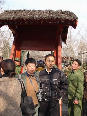 一夜北风紧,开门没雪飘。7号早上8:30,我骑个破车穿着那件极其醒目的蓝羽绒服哆哆嗦嗦冲到三环,在和同学汇合后倒了n次车来到大观园,而另外那位我高中同学的大学同学已经买好票在等了。说好活动是10:30开始,可快到11点还不见有人来。眼看人越聚越多,我掏出了记者证,与拿数码相机的同学一人一个,于是大门口最有利的地形被我们占了两席。