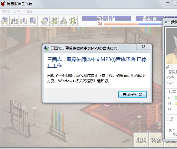 刚把所有5.8版本补丁下好后玩的时候中途突然显示“三国志。曹操传简体中文MP3仿音轨经典 已停止工作”,然后就直接关闭了。。。这个怎么解决啊?跪求大侠帮助~另外怎么发图啊。。。我还不会发。。。感激不尽~~我是win7系统