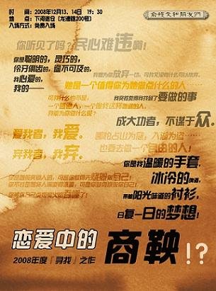 眼看着话剧市场火热抢手,于是阿猫阿狗们都钻进来插一手挤一腿,于是各种各样的人都来演话剧。对我来说看到这些光怪陆离的名字,本能的第一反应就是:他们可以吗?怀疑终要经过实践去检验,果然是天意啊,实践的机会就这么突然来了,2008年7月25日在办公室接到潘泽同学的电话,告诉我要带我去看免费的话剧,模仿潘泽的习惯用语表达我的心情那就是:“这还冷静的下来啊!”、“择日不如撞日!”,听到免费的东西哪里还用多问,傍晚就冲向约定的剧院。
