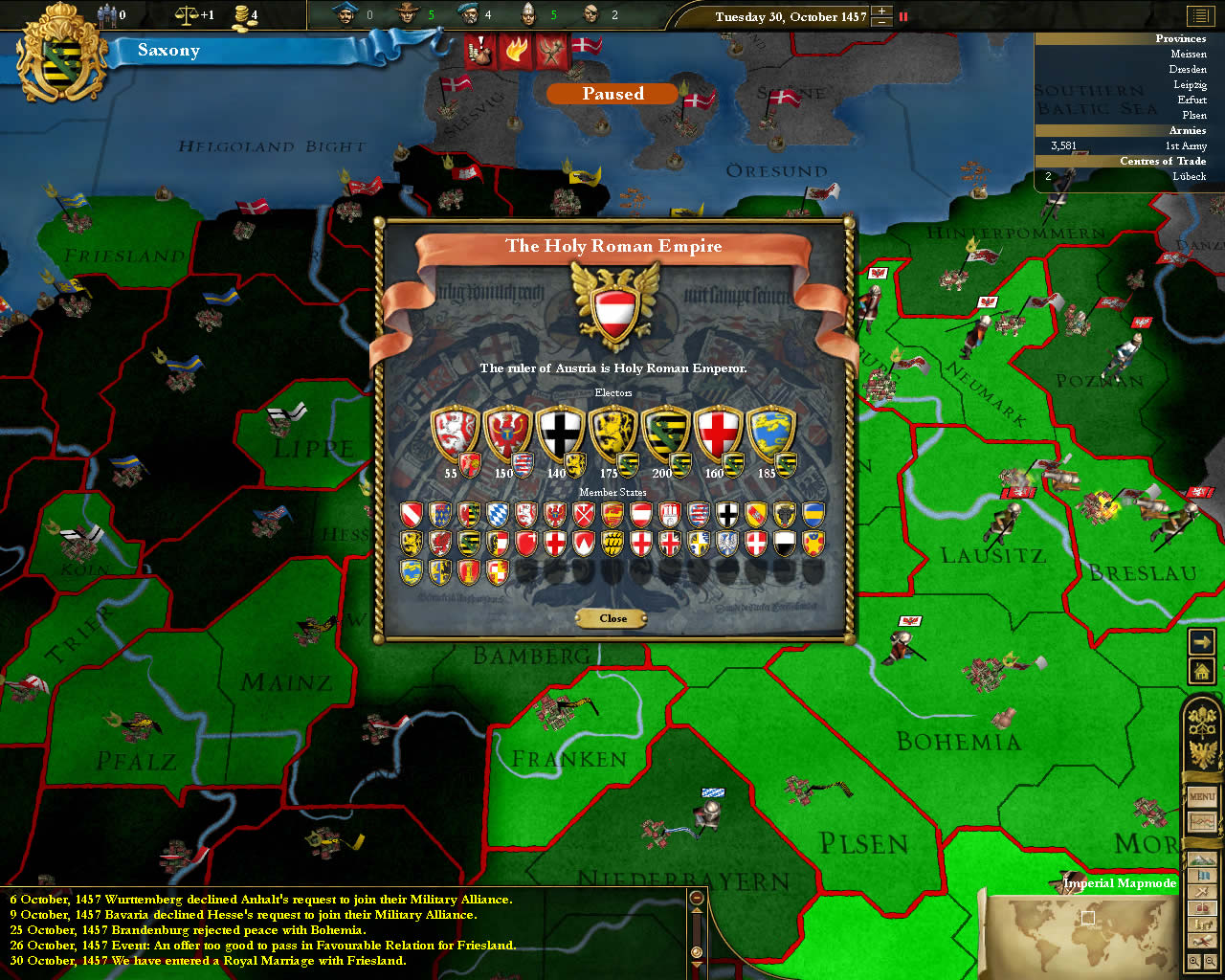 (作为神圣罗马皇帝的奖励加成:每年额外增加1位外交官及1个声望点,并且谍报效率+5%。此外每个成员国每月还将贡献1个金币的稳定投资,+50%后备兵源,+2陆军规模上限——当前成员国总数为33个,因此总数相当可观)