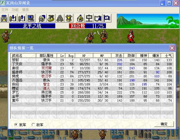 这个理论是行得通的,不过怎么你的金甲被打退了城门也不自动关上的,我刚才去试了下,我冲了四人出去外面,守门金甲被击退后,城门就关了。难道要先把城里的武魁杀掉才不会自动关城门?我有个高级档也是跟你差不多级,有两个仙人果没吃,一吃管也能29,我前面冲得还行,后面见冲高级档,敌方装备太好,我方都还是穿那些+10 防御 +10 攻击的装备,27级也没见他出合叶甲那些出来给买了换装备,高级档一路下去会越来越难打,敌我装备和兵种相差太大,太悬殊,就没用心冲级玩了。我在牛头沟买了4把40+的刀和枪,在这上一关打孙家兄弟就见砍不动了,差一点不能21回合全灭多拿勇壮果,没站好位,引不出城里的孙德,一直把小怪杀了才能杀他,拿升到2级武器+50多的刀都砍不动人,总是砍15点左右,太郁闷就不玩了。冲高级比压级难打太多了,楼主17回合全灭很快,感觉很强大啊。我不知道怎么样才能不关城门,试了好多次,最后被城里的敌人打退城门也关,搞得不能进来帮忙杀敌,城里的都是被蛮骑兵克制的兵种,罗成 老罗都很菜,不停的要帮他吃包子,不然就被打退,很郁闷。主战人员进不了内城帮忙杀555555555
