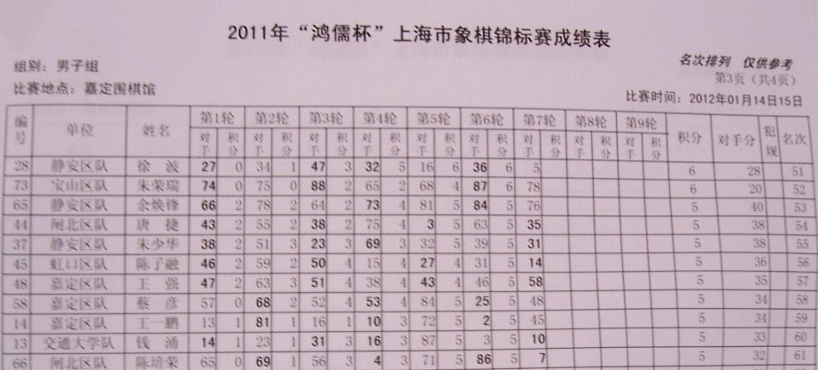 标题: 2011年“鸿儒杯”上海市象棋锦标赛参赛流水帐