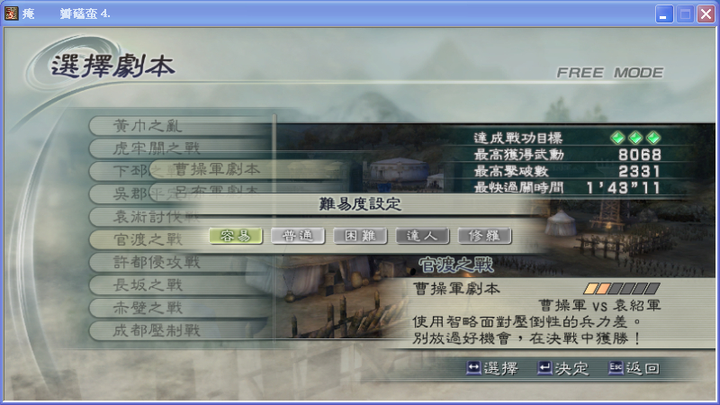 335的难度指什么您还不知道?难度是指本身的难道,就是指战役本身的难度,而不是指普通修罗什么的。刷兵器要选择难度大的,而且完成战功要多。所以我都是在许都侵攻战选择吕布军简单难度刷,这样战功容易全部达成,而且快速。