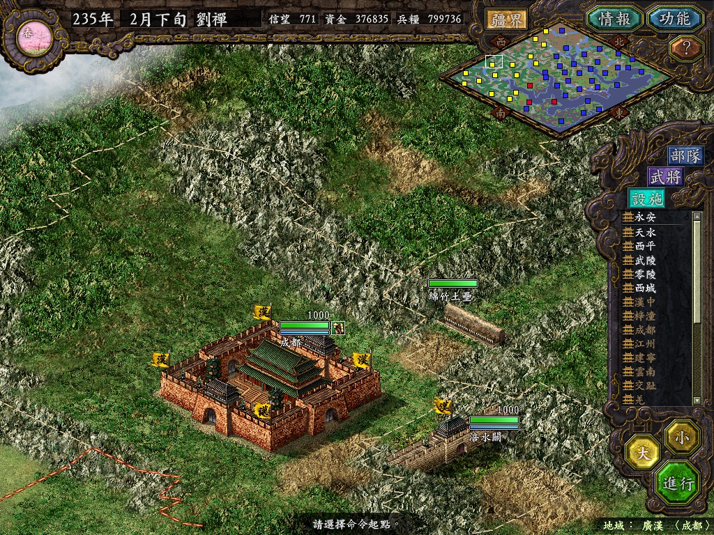 大年三十,玩三九来守岁,强度一百五。此前一路波澜不惊,下天水,平南蛮,夺交趾,进西城,伏羌王,占安定。不想除夕夜风云突变,一时大意,派大军进逼金城、西平时,居然被长安、武威的敌军从背后突袭,可怜安定只有一万守军,被八万敌军围攻,虽有张翼、马忠等将拼死抵抗,奈何杯水车薪,只得分批突围。安定旋即被费耀攻陷。(以前还真是小看此人了,这次安定攻势就是他带头发动的。)还未撤退到天水,永安又有告急文书送来,张郃、徐晃为首,大军十二万杀至永安城下,此时西平、金城未下,安定陷落,诸葛军师、马、赵、魏皆在西凉,成都仅余一帮文官若是永安再失守,蜀中门户大开,后果堪虞。当此危机之时,后主刘禅亲领成都一万御林军,星夜驰援,又火急调交趾守将霍弋万里转还。再命秦宓等一帮文官率领百姓上城头奋力抵御。好在后主刘禅大公无私,早先曾捐出先皇雌雄宝剑,命成都一班文官在绵竹演习得兵法精熟(我承认我很无聊,手下一班文官都被我练出了奋战,看着刘禅带着一班文官披挂上阵厮杀,我真有点过意不去了,可谁叫这是非常时期呢。:)),接下来的战斗可用惨烈来形容,徐晃、张郃不愧是五子良将,箭不虚发。三旬内连续狙杀霍弋、张绍、朵思大王、秦宓,谯周、刘贤、刘循、蒋斌死战不退,没于乱军之中,郤正、句安在城头被乱箭射死,黄权父子身带重伤。幸好,马谡关键时刻连施妙计,陷阱发动,才终于退得曹魏大军。此时永安五万大军也只剩不足五千了。。。。。。。。。