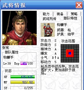朋友的张将军转职金枪将没有?拿盾牌的是转职前的形象,1楼的档张宪未到40级,所以也是这样的。另外转金枪将后可以穿透攻击三格了,拿沥泉枪极其霸道