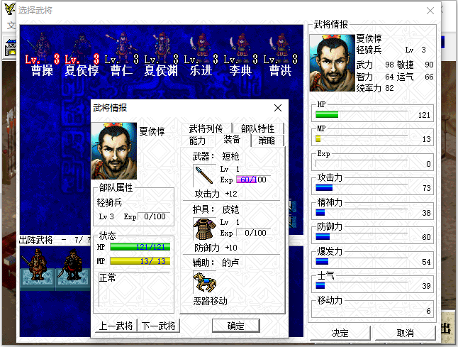 曹操91(8)夏侯惇43(27)曹仁67(54)夏侯渊69/MP10(18)乐进121(3)李典117(3) 曹洪153(3)