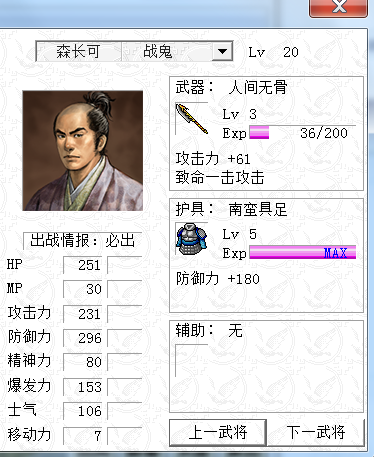 楼主,目前37关新版发现在29关和30关间的毛利辉元登场这个剧情处吉川元春的R形象会变成色块。此外森长可加入后自带的南蛮具足直接Lv5满级,不知是有意设置还是bug呢?如果是有意设置,感觉他就太强了,本身的战鬼职业就能穿三格攻击,加上达到条件后自带的人间无骨就已经够呛,如果盔甲再过强我就不敢用他了,怕有损游戏性,不知是否可以改进?谢谢。