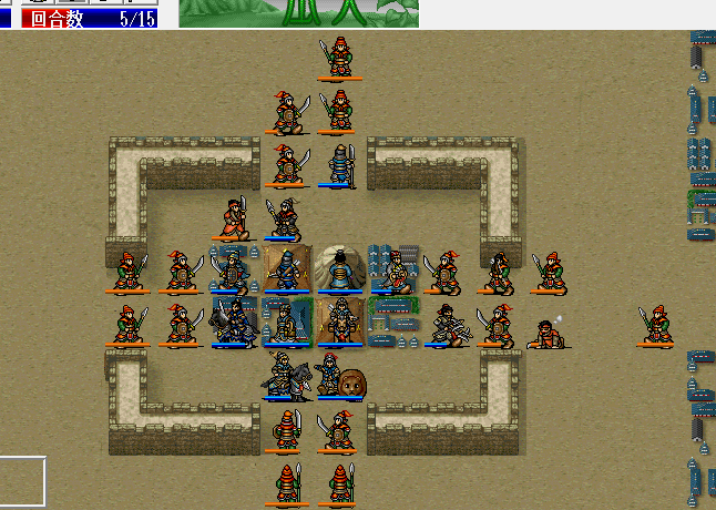 第二回合则合三人之力把关羽左边的小兵打残,让黄盖过来收,曹操上去给黄盖加一口
