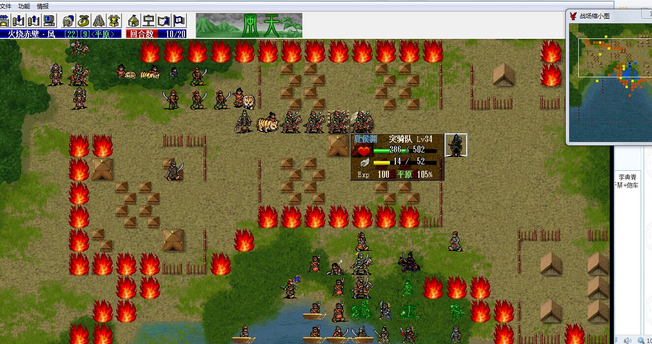 7回合触发灭火,20回合全灭敌军外加逃跑,耗时一晚上,不出场人员,许褚,曹洪,徐晃,3大山地将,精神低不耐打,主要装备,炮车加吸血,于禁黄金甲,典韦干将+象牙+手套,李典青冈+回血+踢云,大夏突破+远程衣+盾,小夏侯虎筋+亮银+的卢,张合龙胆+爆发衣+地形马,思路:主要集中在右手边,优先击杀名将,特别是攻击力高的名将,(别问我怎么杀,于禁+炮车+乐进+典韦,还不死的基本也就剩补刀了)若攻击范围有会补血的文官等,能灭就先灭掉,最后将干将给张辽,绝影给郭嘉,合理跟曹操搭配,一回合可以多走2步路,这关真心很辛苦,敌军全部地形100-110,我方都是大多100及以下,感谢制作组,这关杀得很开心;