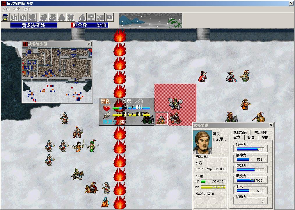 俺的方法是高宠单击(一定不能双击)5号拐子马,老牛吹它一下。伍尚志原地干啥都行(就是不要补血)。这样敌方回合王贵虽然会被反击一下,但是张显却会右移一格杀掉5号拐子马,从而挡住7号拐子马对王贵的攻击点。