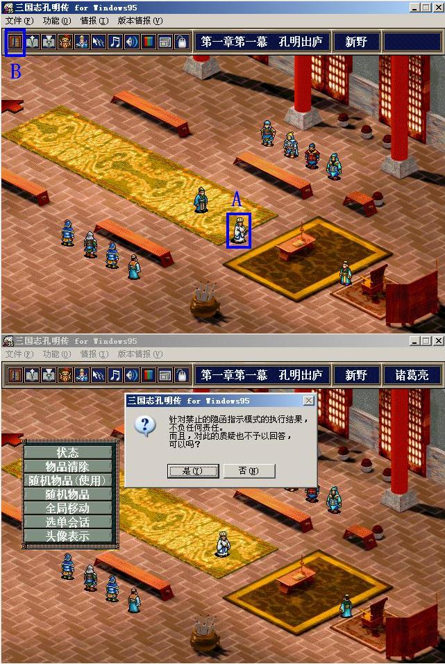 1、鼠标放到孔明身上,速度设定最快的情况下1秒钟就够了,速度设定慢的话要等好一会儿,位置如图的A处;